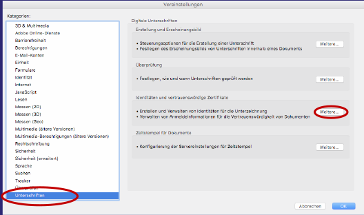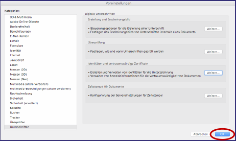 Unterschriften. Rechts daneben wählen Sie jetzt Identitäten und vertrauenswürdige Zertifikate und klicken auf Weitere. |